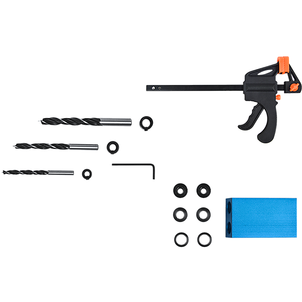 - Accessories: 3 drill bits, 3 stoppers, 6 sleeves, 1 hex key, 1 F-clip, and a set of bags