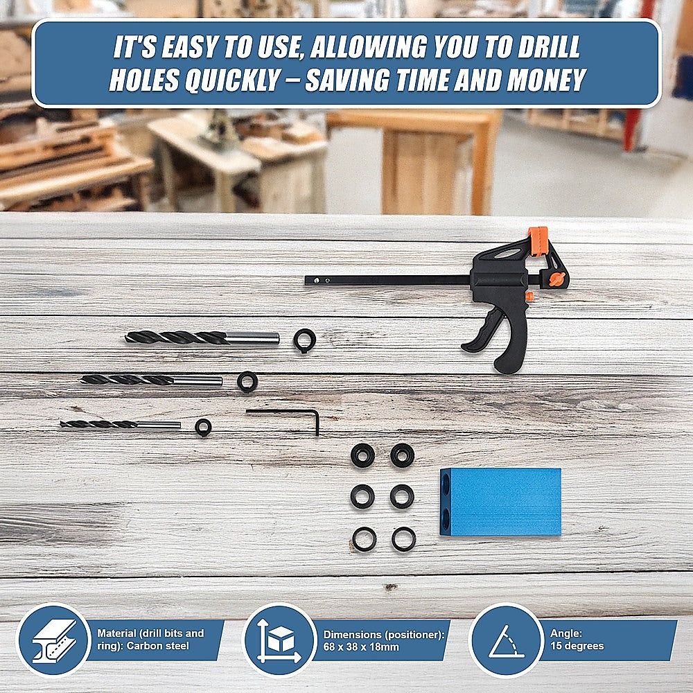 Small in size, it fits easily into any toolbox. It's easy to use, allowing you to drill holes quickly saving time and money. If your work or hobby involves working with wood, this tool set is a must-have. Buy one for yourself or buy it for a gift for the carpentry enthusiast in your life. Order yours today!