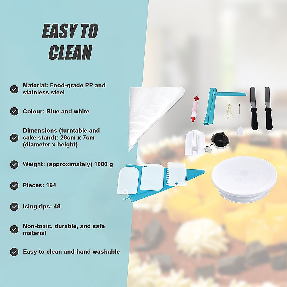 - Accessories: Straight and right-angle cream trowels, 3 cream scrapers, 2 flower nails, 1 flower lifter, 1 tip cleaning brush, 1 straight cake spatula, 1 curved cake spatula, 2 cake nozzle couplers, 100 disposable icing bags, and 1 12-inch reusable pastry bag