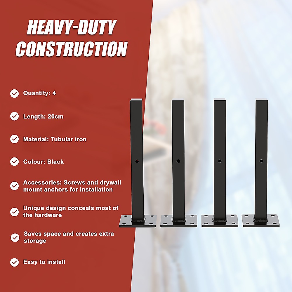 Crafted from black tubular iron, these brackets are as sturdy as they are stylish. Their neutral black colour blends into the background while their unique design hides most of the hardware. They're easy to install in mere minutes and come with all the hardware you need to get the job done.