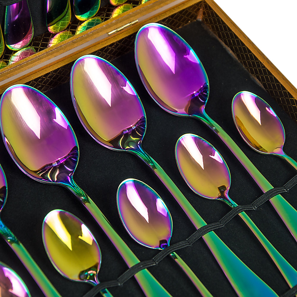 Put some colour on your dinner table with this shimmery set of cutlery by Randy & Travis Machinery. Crafted from rainbow-hued stainless steel, this 24-piece set makes a colourful addition to your tablescape. And, if you have some kiddos who are a little picky when it comes to eating, having a rainbow-coloured fork or spoon might just get them to the table to eat. And, for adults, they're the perfect complement to your table for special occasions – or even everyday use. With their rainbow of colours, they'll blend seamlessly into your table's colour palette. And, with service for six, this set accommodates even large families.