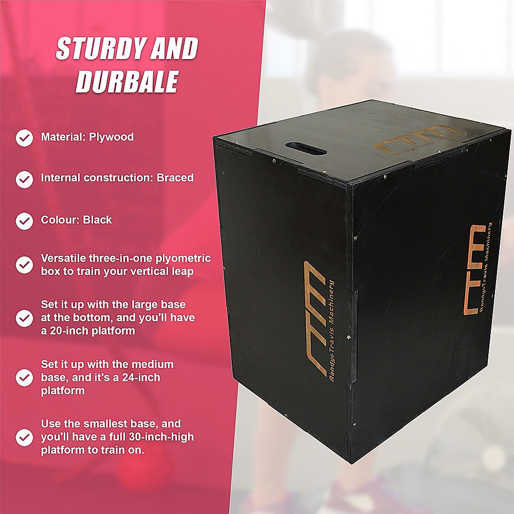 Gain more height and explosiveness using Randy & Travis Machinery's versatile three-in-one plyometric box to train your vertical leap. Turn the box three ways to start small and work your way up to a full 30 inches. Set it up with the large base at the bottom, and you'll have a 20-inch platform. Set it up with the medium base, and it's a 24-inch platform. Use the smallest base, and you'll have a full 30-inch-high platform to train on.