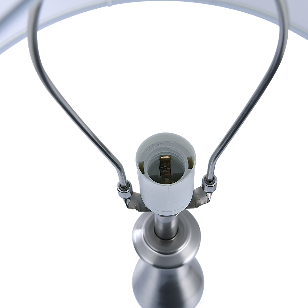 Perfect for a traditional look with a touch of contemporary, this gorgeous three-piece nickel-finish set of Palermo lamps will take centre stage wherever you put it in your home. With a stunning floor lamp and two complimentary table lamps, this set will give your room a magazine-worthy makeover in only a few minutes. Topped with a cream fabric shade, the graceful, curved floor lamp will accent any corner in your room, providing you with a cosy, well-lit corner to read. Two matching table lamps, each set alongside your sofa or love seat, provide pops of metallic nickel colour to complete the look.