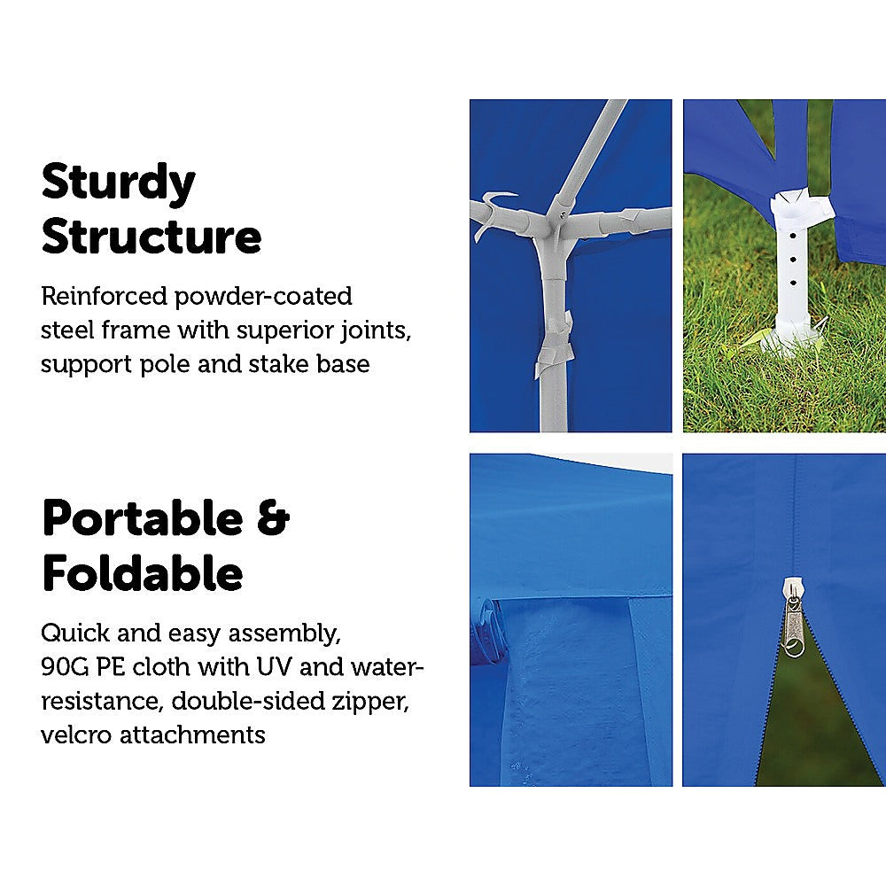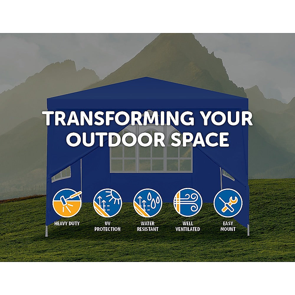 Featuring a thick steel frame and extra heavy-duty cloth material, the 3 x 3m Gazebo - Blue, is built to last, and designed to withstand most any weather condition. Beyond the classic tent design, 4 walls are included - for added privacy, shade, and protection from the elements. These walls may be rolled up in order to suit your custom needs. The 3 x 3m Gazebo - Blue, has the large dimensions, sturdy construction, and versatile wall features you need to beat the heat and make your next outdoor event a special one.