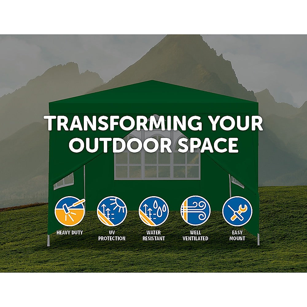 Featuring a thick steel frame and extra heavy-duty cloth material, the 3 x 3m Gazebo - Green, is built to last, and designed to withstand most any weather condition. Beyond the classic tent design, 4 walls are included - for added privacy, shade, and protection from the elements. These walls may be rolled up in order to suit your custom needs. The 3 x 3m Gazebo - Green, has the large dimensions, sturdy construction, and versatile wall features you need to beat the heat and make your next outdoor event a special one.
