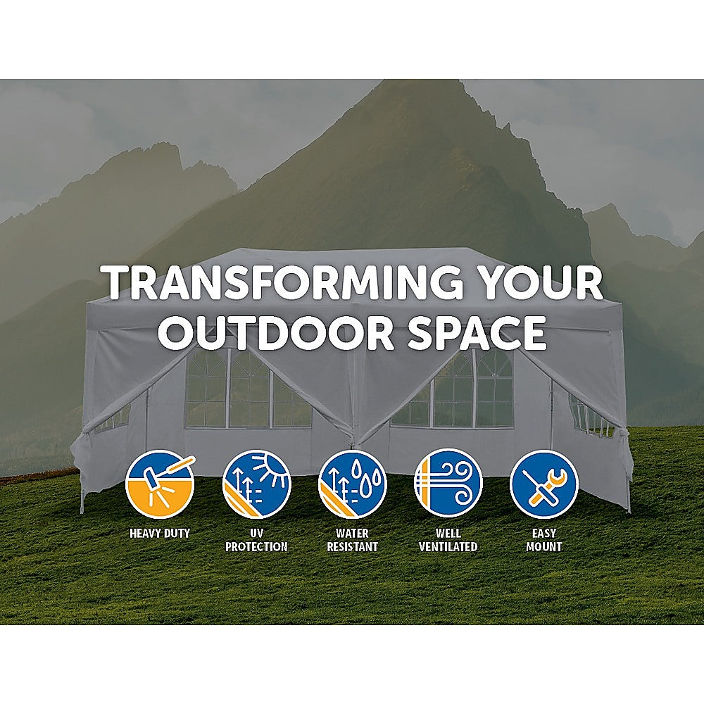Featuring a thick steel frame and extra heavy-duty cloth material, the 3 x 6m Gazebo - White, is built to last, and designed to withstand most any weather condition. Beyond the classic tent design, 4 walls are included - for added privacy, shade, and protection from the elements. The 3 x 6m Gazebo - White, has the large dimensions, sturdy construction, and versatile wall features you need to beat the heat and make your next outdoor event a special one.