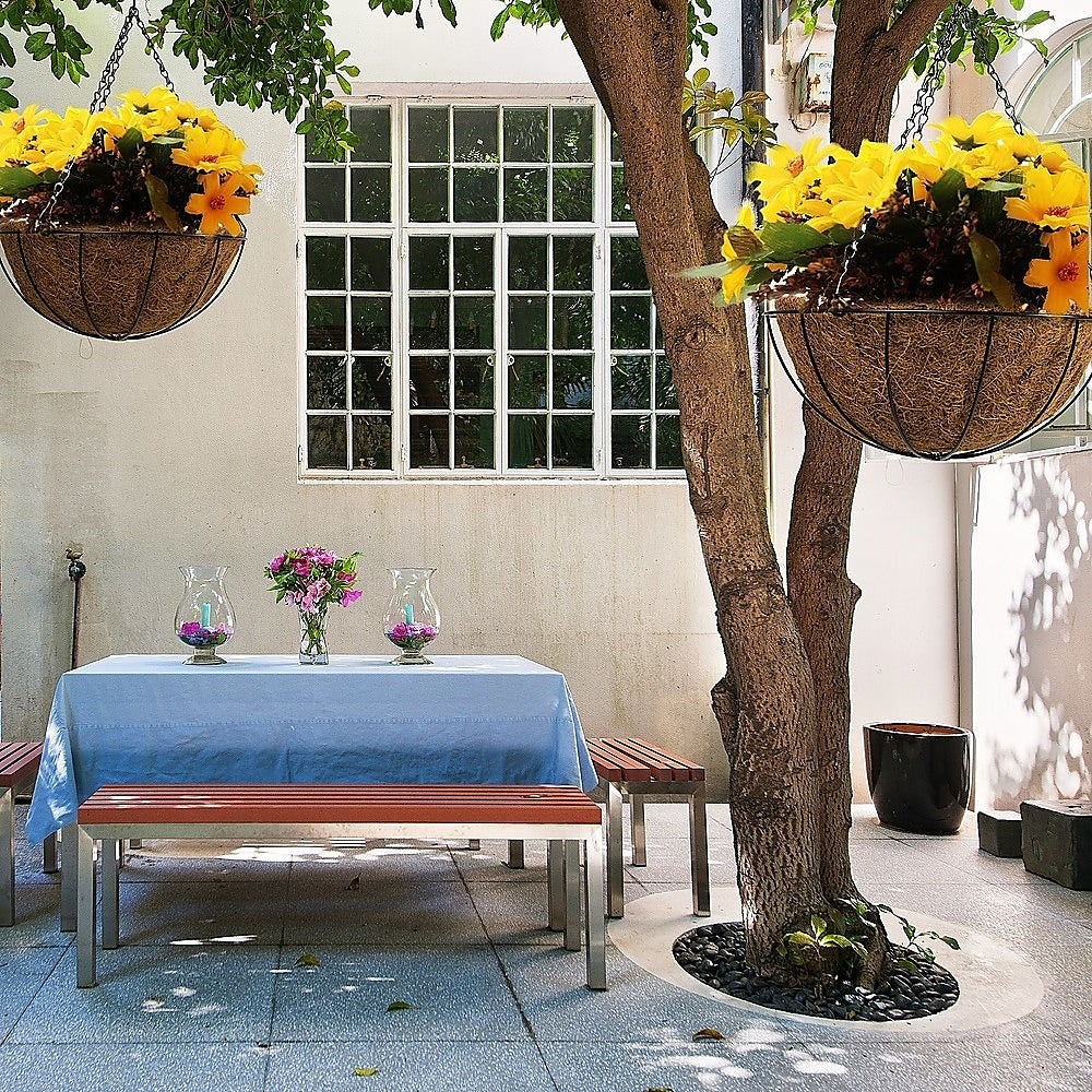 Summer's here — and it's time to display those gorgeous flowers in a setting that accents their beauty. With these four large hanging baskets from Randy & Travis Machinery and your choice of flowers, your house will be the showpiece of your neighbourhood. Crafted from black iron and coconut fibre (coir), these baskets provide a natural setting for your favourite plants. And, if you have a coir entrance mat, they'll give your entry a pulled-together, designer look. Although the iron wire and chain look delicate, they're incredibly strong. Their neutral colour and minimalist profile make your plants the centrepiece of your display. And, they're durable enough to last for many years to come.