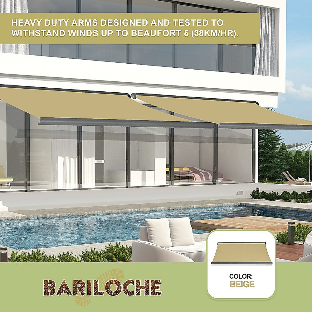 The Bariloche is a compact, motorised, full cassette folding arm awning with a neat contemporary design. It has heavy duty folding arms, designed and tested to withstand winds up to Beaufort 5 (38km/hr).
