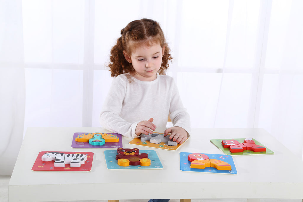 Wonderful set containing six first puzzles to complete. The set includes six sturdy, colourful background cards. The cards have a recessed shape to build the puzzle in with a line drawing of the animal they are going to build. Match the chunky wooden pieces to the drawing to complete your puzzle. The recess in the card stops pieces sliding about as little hands develop the motor skills to assemble the puzzle. Six delightful animals to create. All comes packed in a convenient sturdy storage case.