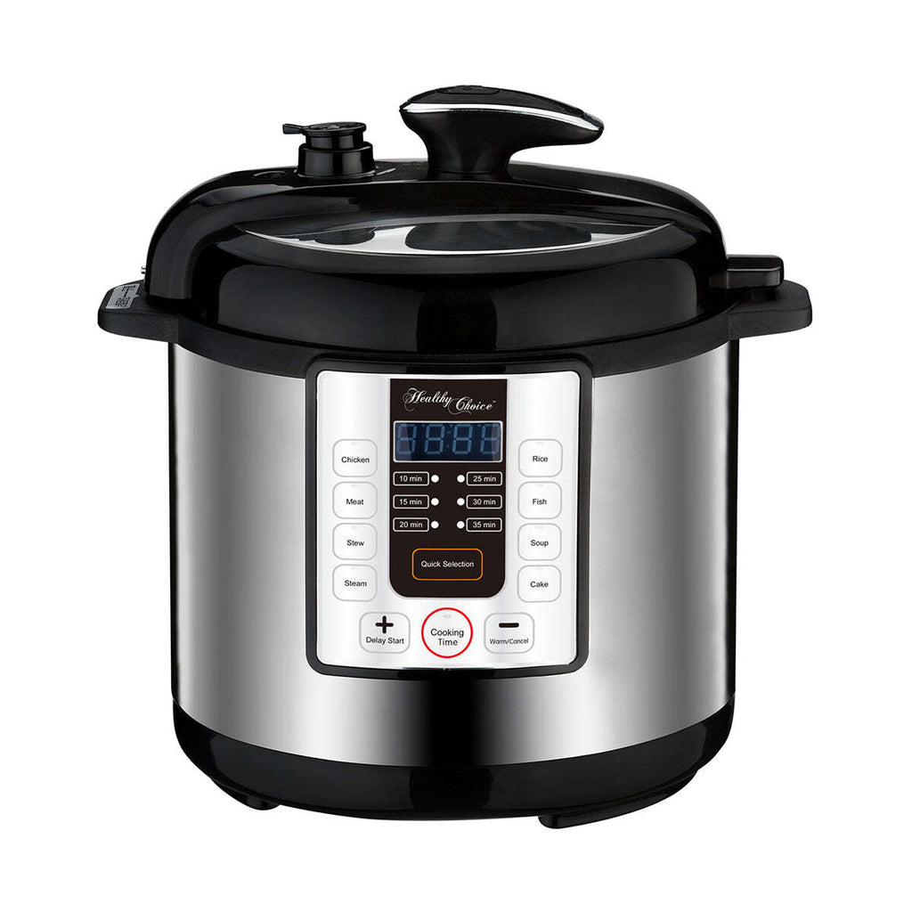 - 6L Pressure Cooker, 4-LED digital display, 8 cooking programs, 6 quick select pressure time selections, 24-hour timer delay start, 60°- 80°C keep warm mode, 6-litre non-stick aluminium inner pot, 8 levels of multi-security protection, detachable steam vent and inner lid, easy to clean