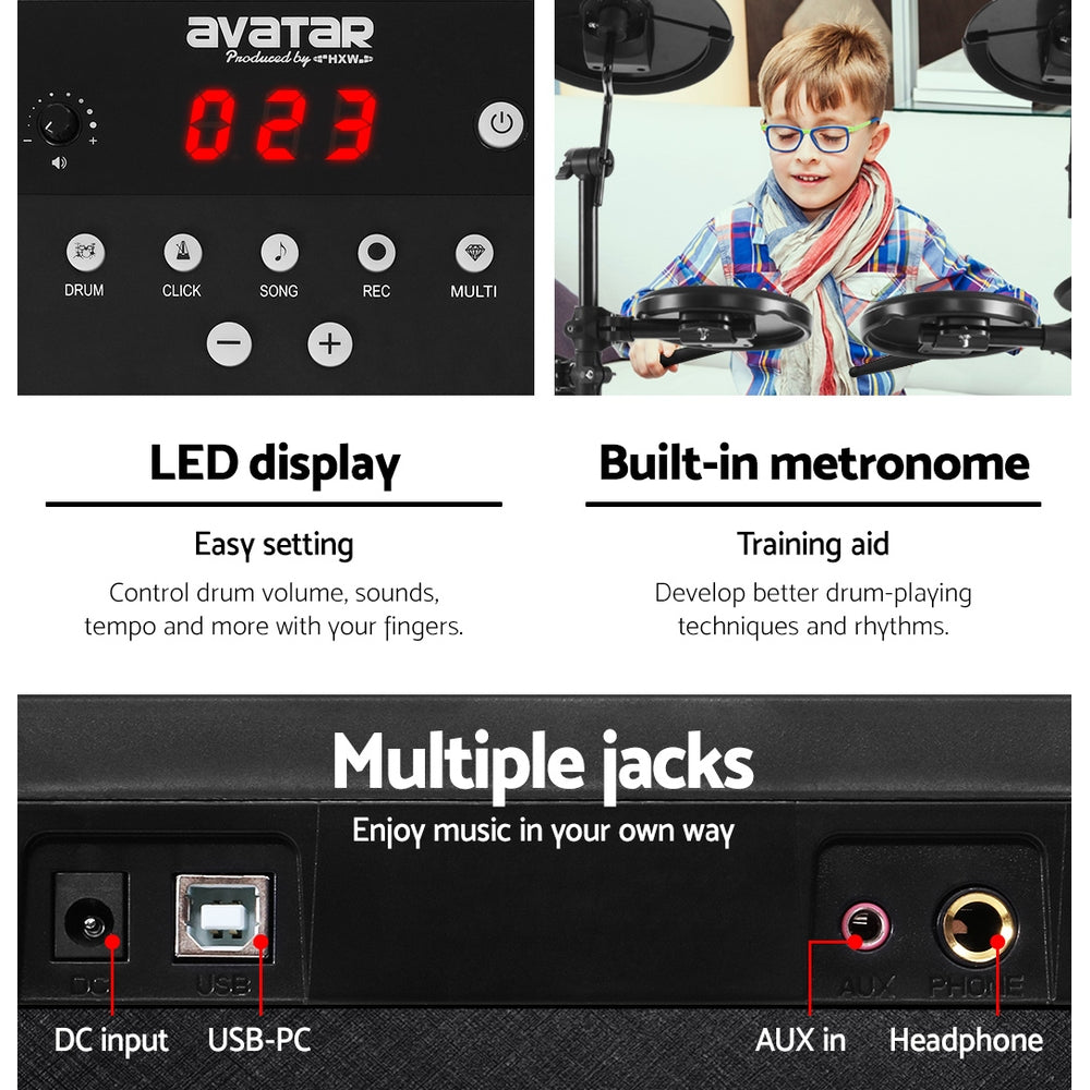 The drum kit comes with exceptional built-in features: 30 pre-set drum kits, 15 demo tracks and 498 voices. There is even a built-in metronome which is a great training aid, as you can follow the beat to practice yourself. The electric drum kit is sturdy with a reinforced and foldable metal frame and made to feel like a real drum with premium silicone surface. The drumming experience and sound is completely realistic as well, as the cymbals can be pinched to mute, and snare and all cymbals are dual trigger with different sounds produced depending on where you hit them. Best of all, there are a host of input and output jacks so that you can enjoy music in your own way, including in complete silence using a pair of headphones(which are not included in package).