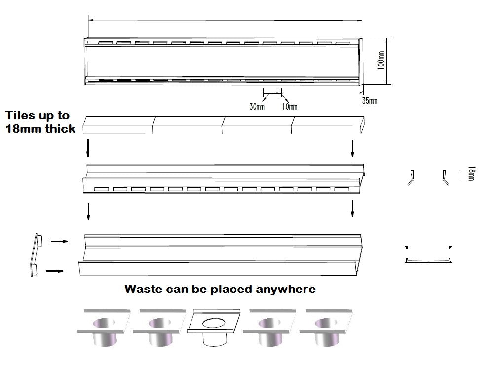 1 x 900mm Aluminium Rust Proof Tile Insert Strip Shower Grate Drain Indoor Outdoor