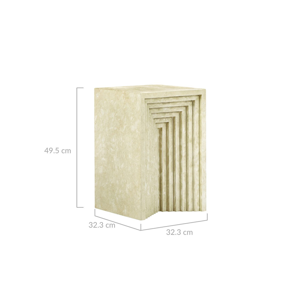 The elegant geometric carved pattern on the side of the Alba side table adds a graphic touch to your home.