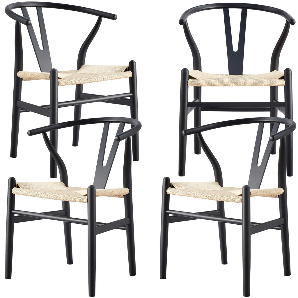 A classy dining chair enhances mealtime delight. Feel it by decorating your dining area with this attractive 4-piece set of dining chairs in black, designed in the Scandinavian style. The iconic Hans Wegner Replica Wishbone chairs, featuring timeless curved back and armrest, with a hand-woven paper twine seat in natural colour, ensure lasting comfort. Because of a wooden construct, and strong legs, they are a beautiful addition to your dining space. They look stunning in any decor settings, thanks to their homely design and sleek style. The beautiful chairs are made of high-quality Beech wood and Recycled Paper Twine, obtained in a sustainable manner. A one-year warranty is included with the fully assembled dining chair.