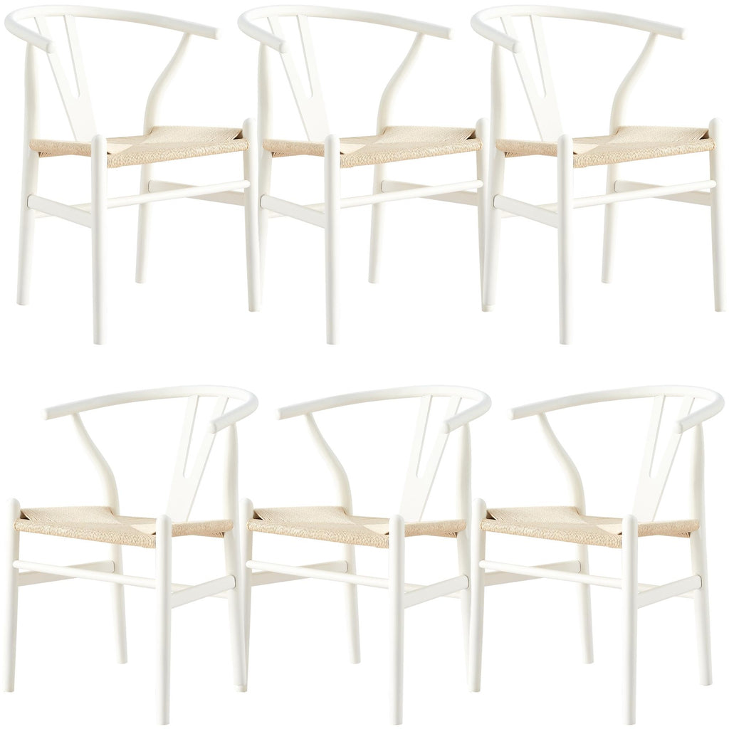 A classy dining chair enhances mealtime delight. Feel it by decorating your dining area with this attractive 6-piece set of dining chairs in white, designed in the Scandinavian style. The iconic Hans Wegner Replica Wishbone chairs, featuring timeless curved back and armrest with a hand-woven paper twine seat in natural colour, ensure lasting comfort. Because of their wooden construct, and strong legs, they are a beautiful addition to your dining space. They look stunning in almost any decor settings, thanks to their homely design and sleek style. The beautiful chairs are made of high-quality Beech wood and Recycled Paper Twine, obtained in a sustainable manner. A one-year warranty is included with the fully assembled dining chairs.