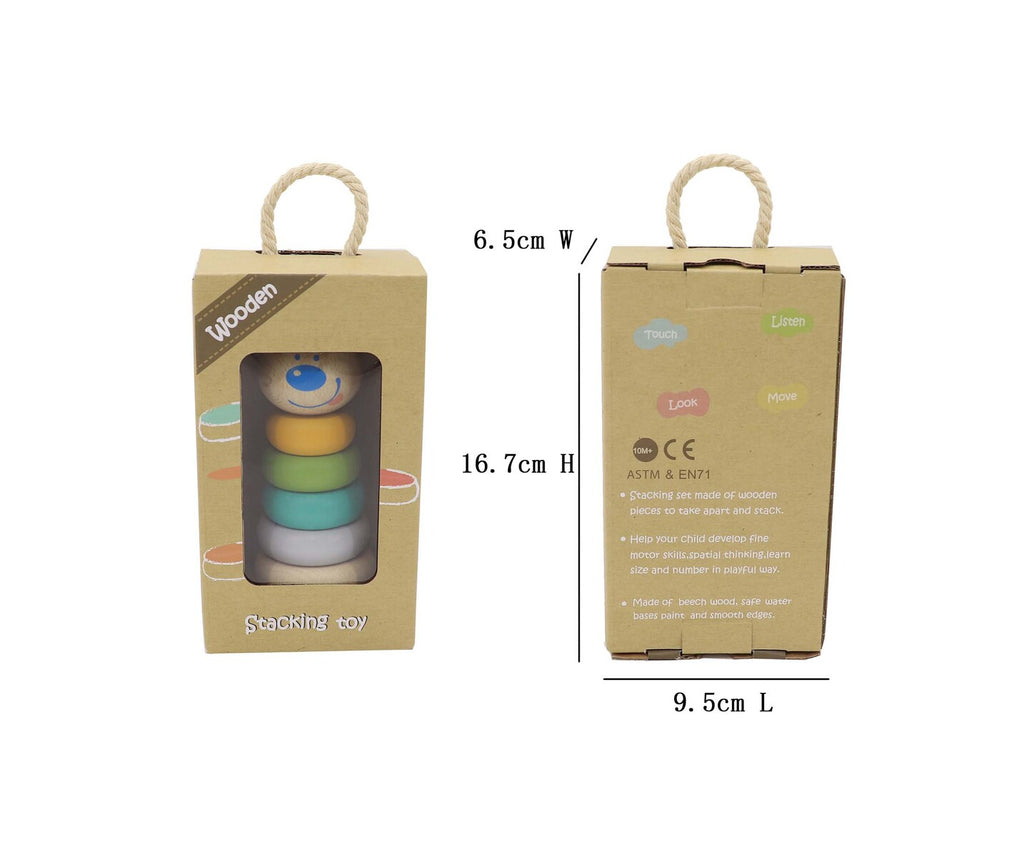 Traditional stacking ring with an animal twist! This wooden stacker comes with five round stacking rings. Where the child can thread onto the central post. Children can explore mixing up the rings, learning about sizes, color combinations and design.
