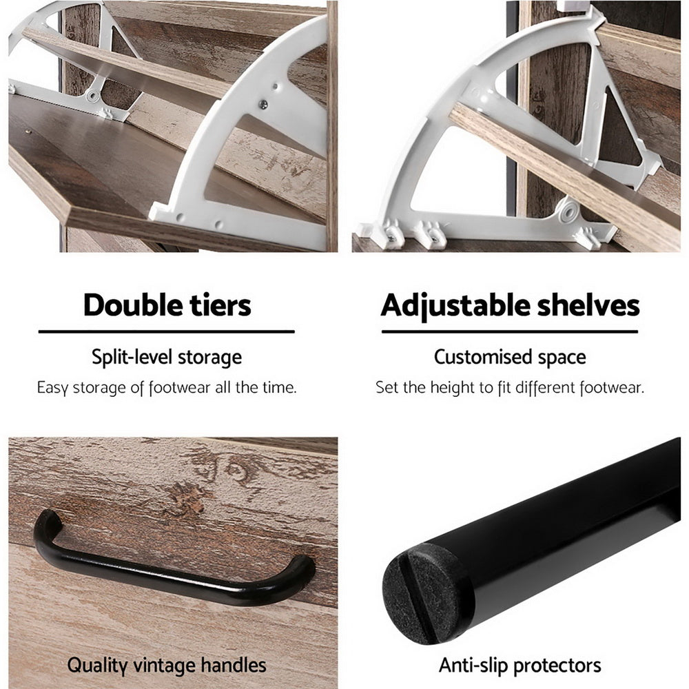 You're shoe proud. That's why you need ample space for all that wonderful footwear. Organise and save your floor space with this industrial chic Shoe Cabinet and have a clutter-free entrance at all times. Designed with adjustable level shelves, you can fit different-sized shoes, heels or boots in the designated row. Making it effortless to get and put back tidily each time after used. With two rows per compartment, there are plenty of space for your shoe paradise. In fact, the entire ensemble can be home of up to 16 pairs of your favourite footwear. Not least, the Shoe Cabinet is finished in a lovely wood grain with meticulous attention to quality craftsmanship. An outstanding presence that makes for a great welcome in any home. Get your 2-level Shoe Cabinet today.