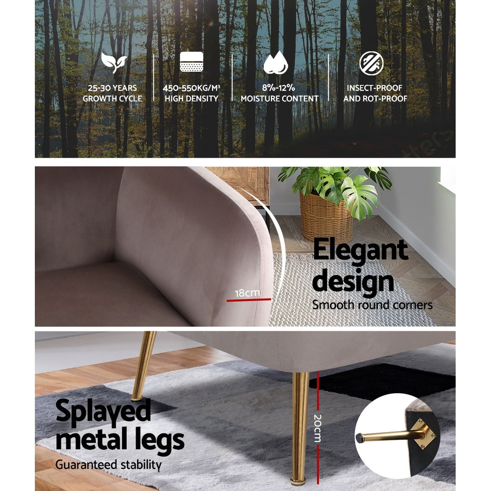 Our Artiss Lois armchair offers a wide and welcoming seat for you to relax and is ideal for every corner of your space where you want to add soft and comfy touches. Crafted precisely and constructed with premium solid wood and high resilience foam, this armchair is quite sturdy and is sure to stand the test of time. It is upholstered in soft velvet fabric that epitomises luxury with its smooth and shiny appearance and adds a cosy and relaxing feel to your space. Plus, the splayed golden metal legs with floor protectors will offer optimum stability and protection to your floors and add a luxurious charm to your space with its gorgeous presence.