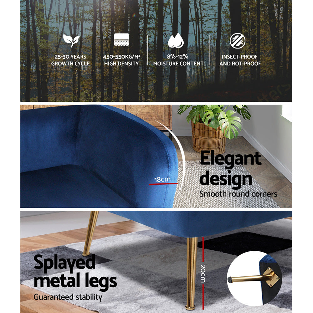 Our Artiss Lois armchair offers a wide and welcoming seat for you to relax and is ideal for every corner of your space where you want to add soft and comfy touches. Crafted precisely and constructed with premium solid wood and high resilience foam, this armchair is quite sturdy and is sure to stand the test of time. It is upholstered in soft velvet fabric that epitomises luxury with its smooth and shiny appearance and adds a cosy and relaxing feel to your space. Plus, the splayed golden metal legs with floor protectors will offer optimum stability and protection to your floors and add a luxurious charm to your space with its gorgeous presence.