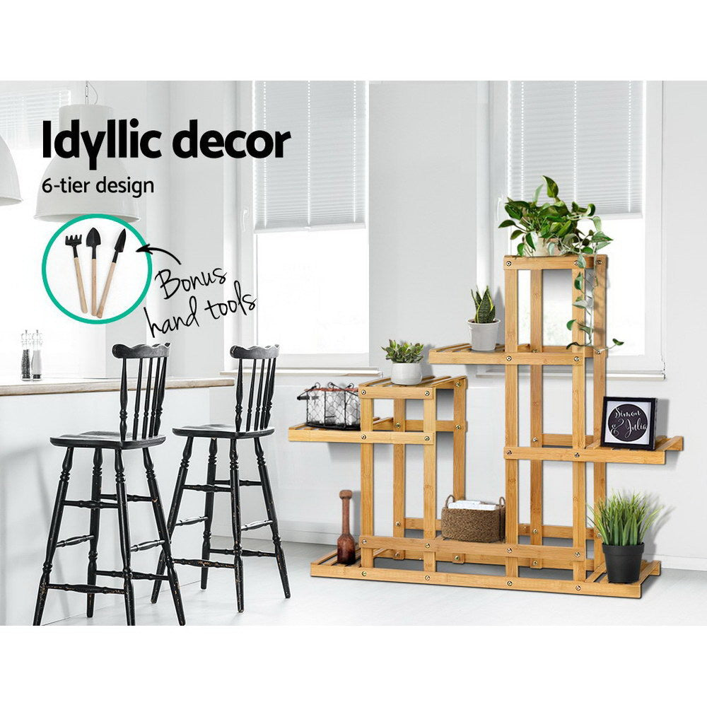 Display your plants in style with our Artiss Bamboo Plant Stand. With its 6-tier shelving, the stand has ample space to show off your favourite flora in your home, patio, deck or balcony. Made of eco-friendly bamboo, the stand has a nice and beautiful sheen as well as smooth surfaces. The stand also features heavy-duty fixings for enhanced stability and weight capacity while the multiple slat design ensures ample ventilation and smooth flow of water from watering. Not least, you can also mix the display of plants with your favourite collectibles for a very interesting display. A bonus set of gardening hand tools is also included.