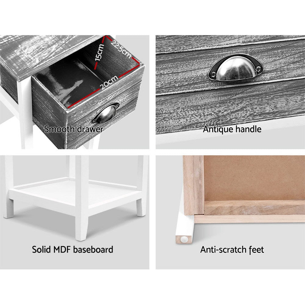 With its vintage chic, our Artiss Thyme Bedside Table is as stylish as it is practical. The 18mm thickness Paulownia wood and MDF construction ensure that the furniture piece is able to withstand daily robust use. The drawer is deep and runs smoothly while the bottom shelf adds an extra display shelf. Use it in any space or in any room where a convenient and compact drawer will do wonders to your storage needs. Finished in an eco-friendly non-toxic paint, the ensemble also includes an antique-inspired handle and anti-scratch feet pads.