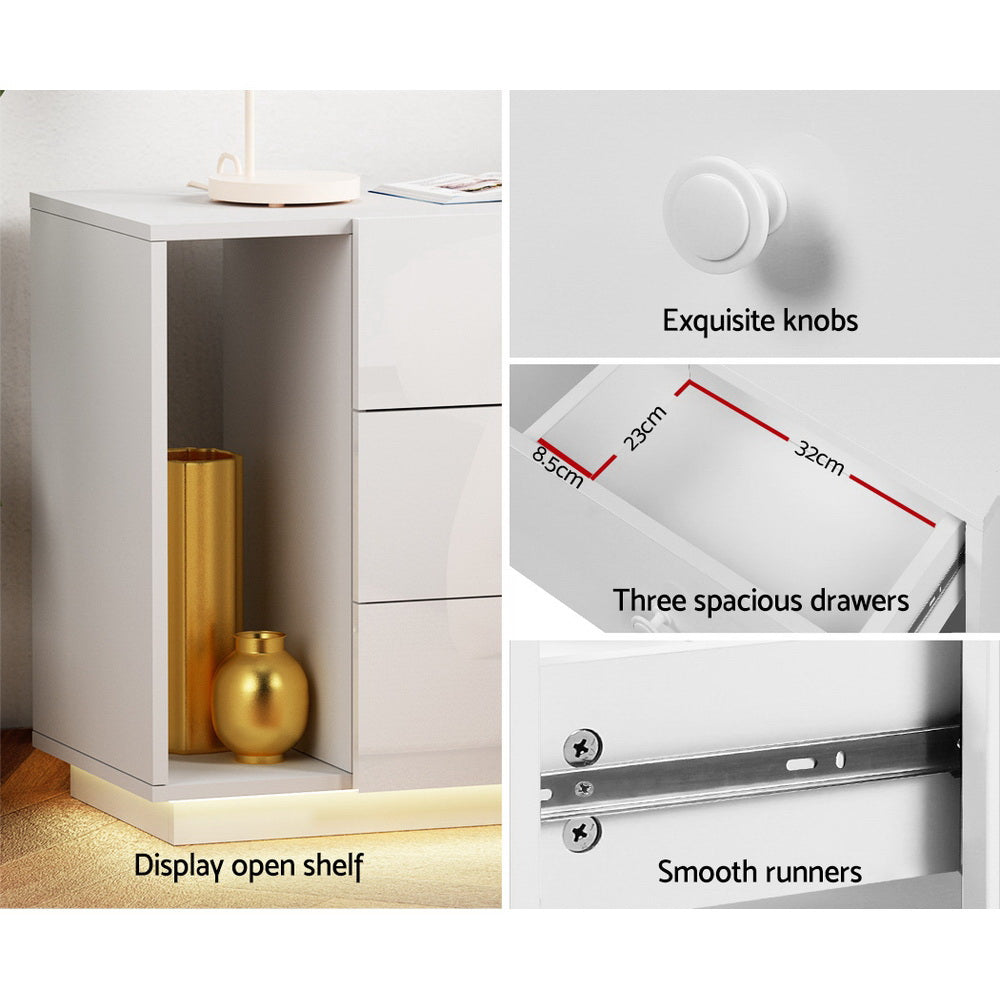 Artiss bedside table with built-in LED lighting is customisable into 16 different colours to suit your preference. It will create a beautiful ambience that you will love to rest in. You also will not need extra bedside lamps or nightlights for your bedroom. This bedside table is handy and designed for convenience and ease of use. It flaunts a beautiful modern design and is practically built to make your life easier and simpler. Furthermore, space is not a concern. It features two spacious open shelves and a smooth-sliding drawer where you can keep your nighttime essentials neatly. Having constructed from quality particleboard with a high-gloss UV front, the bedside table is durable and easy to maintain. It makes a great addition to your bedroom. Not least, the handle-free design exudes a contemporary vibe that stands out from the mundane.