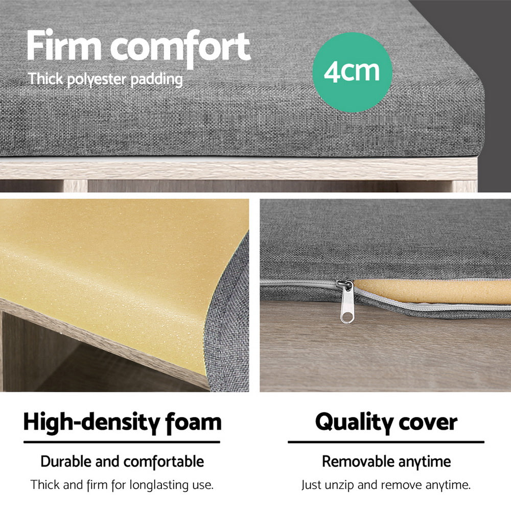 Practical and stylish. Our Shoe Shelf Bench blends two functions into one elegant piece. The shoe shelf features 10 compartments to fit up to 10 pairs of footwear of various shapes and sizes while the fabric bench offers a soft and comfortable rest with its 4cm thick detachable cushioned seat. The entire ensemble is made from eco-friendly E2 board material for strength and durability. Not least, the two-tone design adds an exquisite touch to this very pragmatic ensemble.