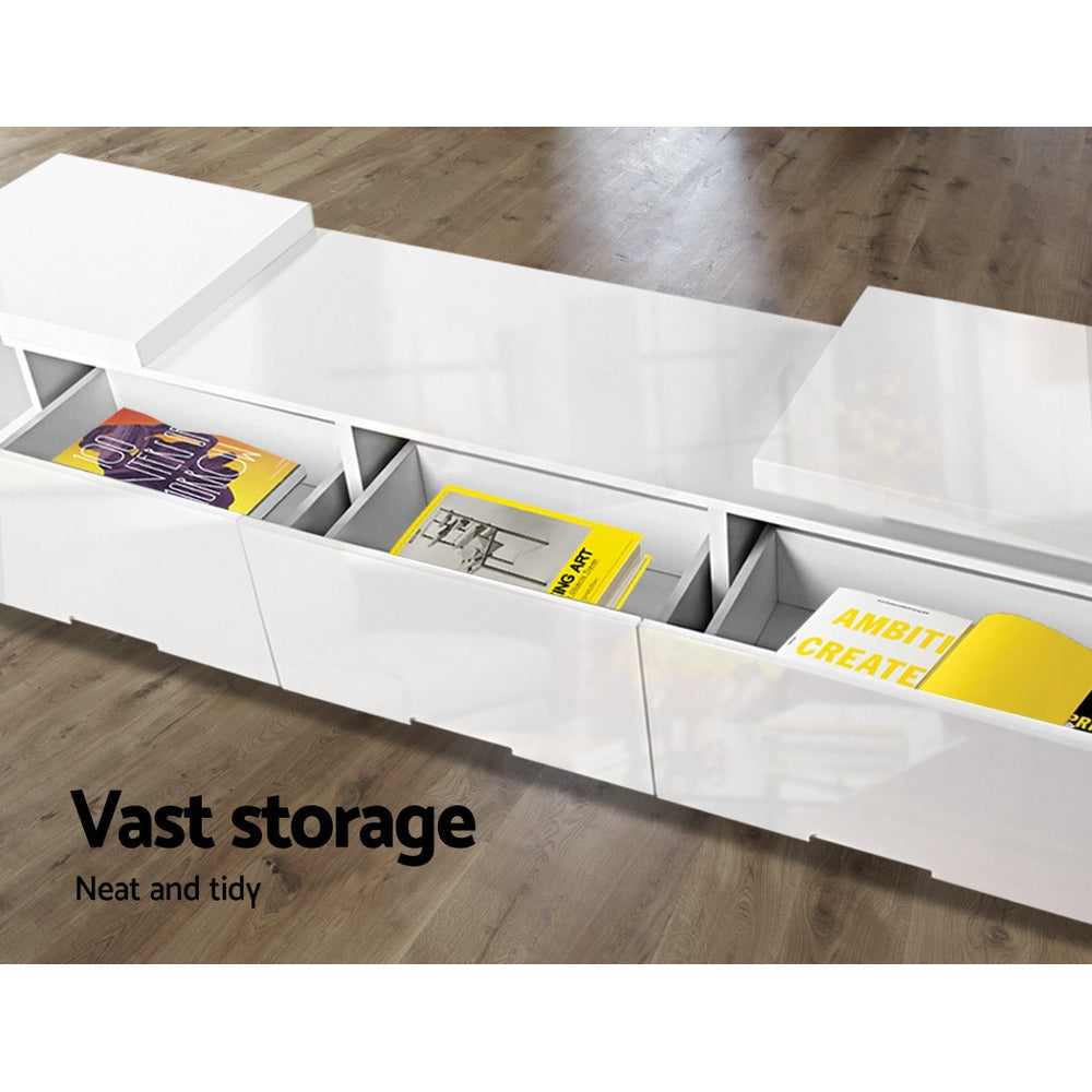 Great in design and quality, this homey TV stand is ideal for home lovers. It features a contemporary design with a high gloss finish and generous size drawers as your hidden storage. With the extendable shelving, you will have no worries for extra home theater systems and home decos to add in your home!