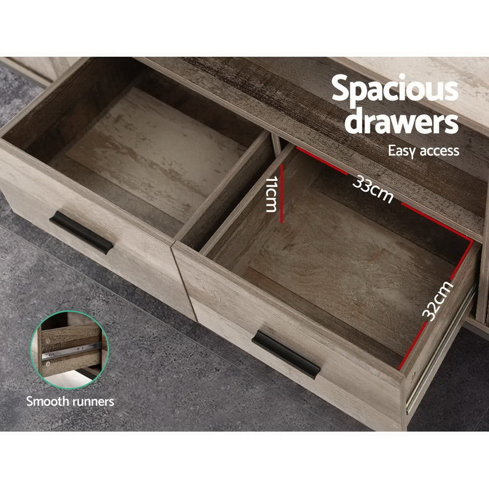 Your treasured home entertainment system deserves the best cabinet for it. And that is why our Artiss Marca Entertainment Unit is the ideal choice for you. Incorporating a contemporary industrial-look design and presented with 15mm and 12mm thick E1 particle board with durable powder-coated steel tube base that provides an eclectic touch, our entertainment unit displays great craftsmanship with equally fine hardware to ensure trouble-free use every time. The unit offers ample storage space with one open shelf, two deep cabinets with magnetic door catches, and two spacious accent drawers with anti-rust runners and beautiful ethnic-pattern front for all your entertainment essentials. Better still, the ensemble features black metal handles on drawer and cabinets to maintain the sleek yet industrial appearance. With a design that will surpass trends and fads, our entertainment unit is your definite pick of an everlasting display piece with timeless appeal.