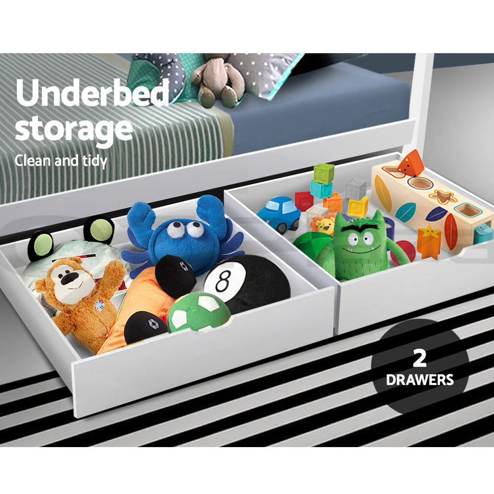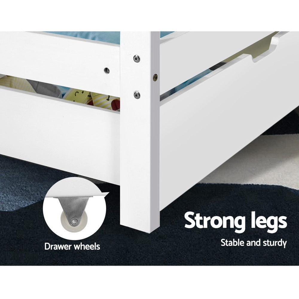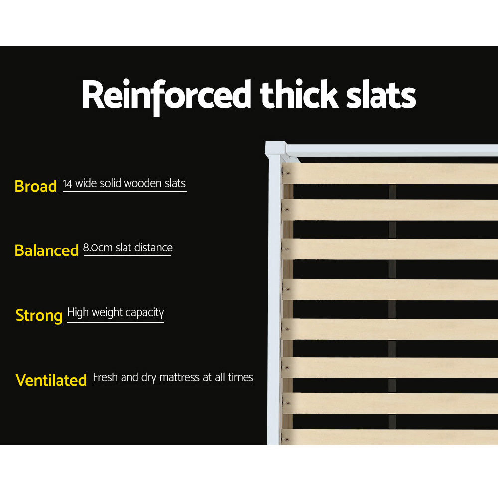 Strong and sturdy, the Bed Frame comes with a durable plywood slated base, reinforced angled brackets for long term support, stylish headboard, heavy-duty steel fixings and smooth edges all round. Finished in a non-toxic, eco-friendly white paint, the neutral-coloured Bed Frame makes for easy décor coordination with any bedroom.