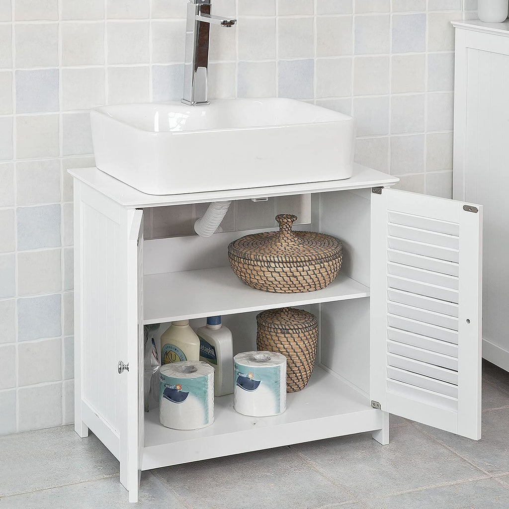 White wooden base cabinet with sturdy frame construction. Simple, clean and practical(Basin not included).