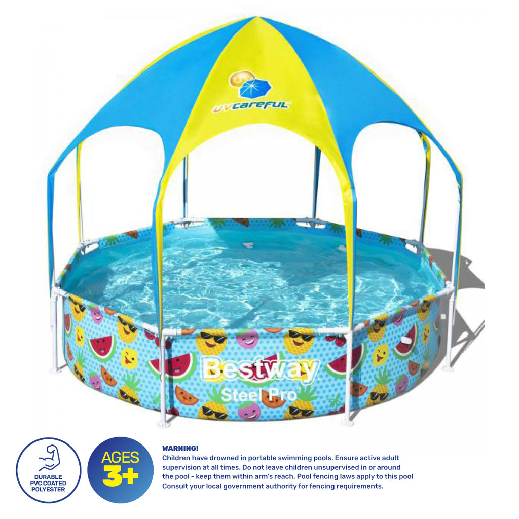 Bestway® Creating hours of fun in the summer sun is this fruit salad printed pool. Quick and easy to set up, this pool comes with a UV protected canopy. A wonderful water activity that is sure to be a favourite for the kids to splash and play in.
