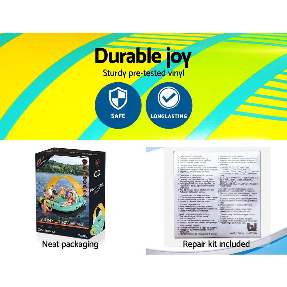 Want to have a great time on the water? Grab the Bestway Sunny Lounge to chill and relax while afloat in your favourite beach, water body or even in the pool at home. Made of sturdy pre-tested vinyl, this 5-person island is the absolute in all-day enjoyment. It features five cup holders, a removable sunshade and three cushioned backrests, along with a mesh opening that lets you dip your toes into the water below. Two heavy-duty handles make it easy to manoeuvre in and out of the water and back to dry land. Also included is emergency repair kit in case you need to do some quick patch-ups.