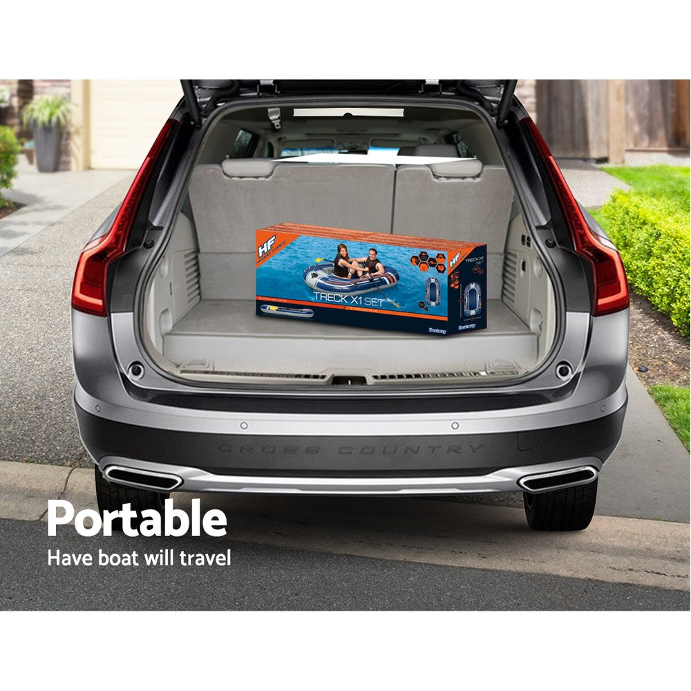 Love to row but do not want the hassle of transporting a heavy boat from home to water? Or creating space to store it? Look no further than our Bestway Inflatable Boat. Completely inflatable, the boat can be up in action within minutes. This awesome inflatable boat has all the necessary valves to make it easy to pump it up (or deflate it), so that you spend more time having fun on the water rather than prepping for it. Not least, heavy-duty handles and an all-round grab rope with built-in guides allow for easy handling. Built to exacting standards, the durable pre-tested vinyl ensures that no water enters the craft and both the floor and seats of the boat are inflatable as well for extra comfort. The boat also features sturdy rowlocks, has a massive weight capacity and includes a heavy-duty repair patch kit. So get ready for a super summer with our inflatable boat and have a great rock and row adventure.