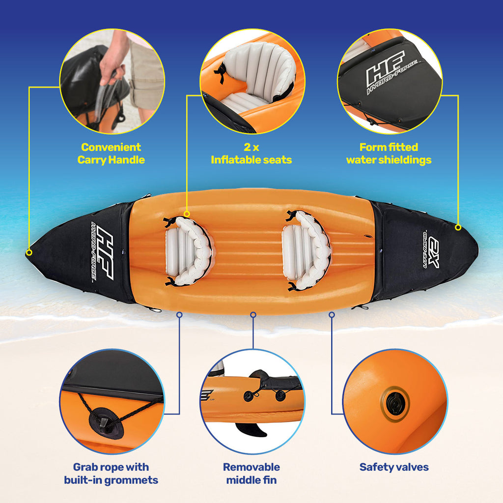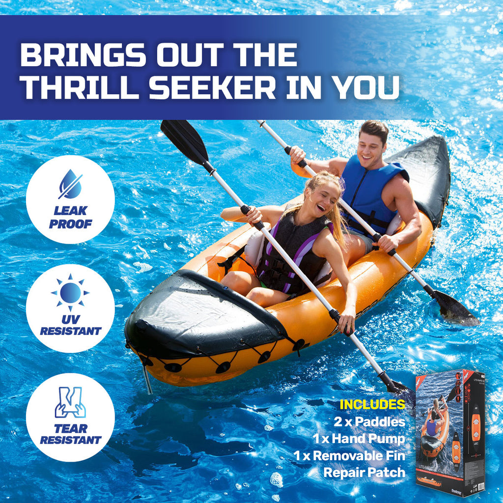 Bestway Lite-Rapid Kayak is perfect for adventures on rivers, streams, fishing expeditions, or a family day's out to the lake. This inflatable kayak is lightweight to carry, only made easier with it's convenient carry handles. Storage and transport is easy with it's quick inflation/deflation screw valves and compactability. The kayak comfortably seats 2 people with its' inflatable seating. It is made of heavy duty, pre-tested vinyl that is leak proof and tear resistant. A must have for any outdoor enthusiast!