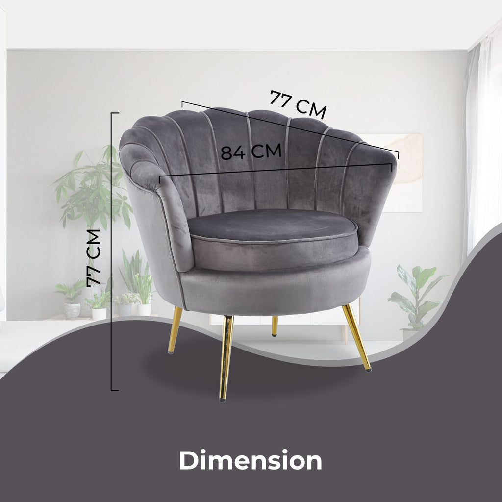 This sofa chair is the perfect relaxation seat in the living room that can also be used as a super comfortable reading chair in the bedroom. Designed in the modern style, the attractive sofa chair in grey, enlivens the comfortable corners of your house. It features a plush velvet fabric seat with a petal shaped back design. The round seat with thick padding gives you the ultimate relaxation when you unwind on it. While the design ensures supreme comfort, its splayed metal legs in a gold colour finish add to its glamorous look. Bearing a maximum weight capacity of 150kg, the sofa chair looks stunning in any decor setting. Pair it with a matching ottoman to enhance its beauty and functionality. The robust sofa chair frame is made of sustainably harvested solid MDF wood and is artistically upholstered in beautiful and durable fabric. A one-year warranty is included with the easy-to-assembly sofa chair.