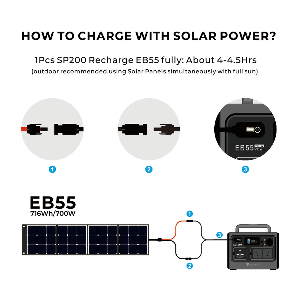 1*BLUETTI SP200 (200W): fully recharge from 0-100% in 4-5 hours.