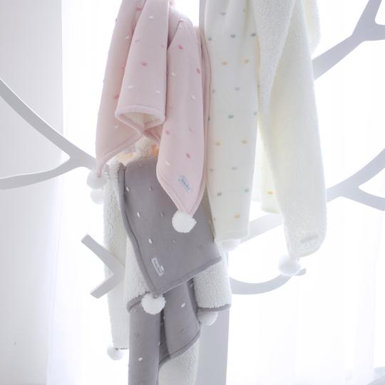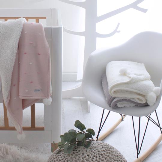 Featuring a stylish embroidered confetti dot front in Bamboo Viscose/Cotton Knit, and a super soft and cuddly fleece lining. With adorable corner pom pom details - our classic Confetti blanket is sure to become one of your baby's favourites.