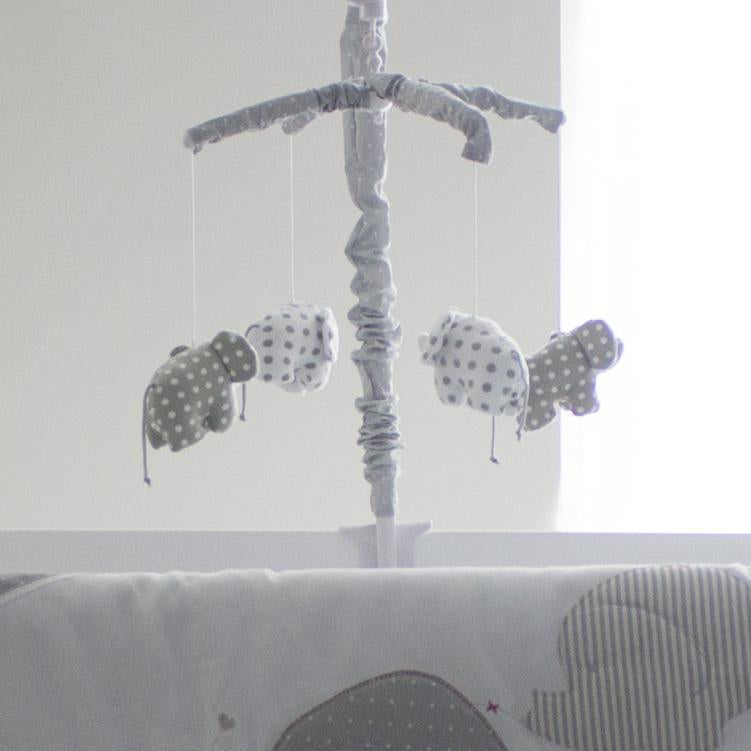 With a simple wind up mechanism our musical mobile from the Bubba Blue Petit Elephant collection soothes baby into a dreamy and relaxing sleep. Featuring whimsical elephants in neutral grey and white with a touch of carnival red. Get ready for spotty dotty elephant fun with this sweet design.