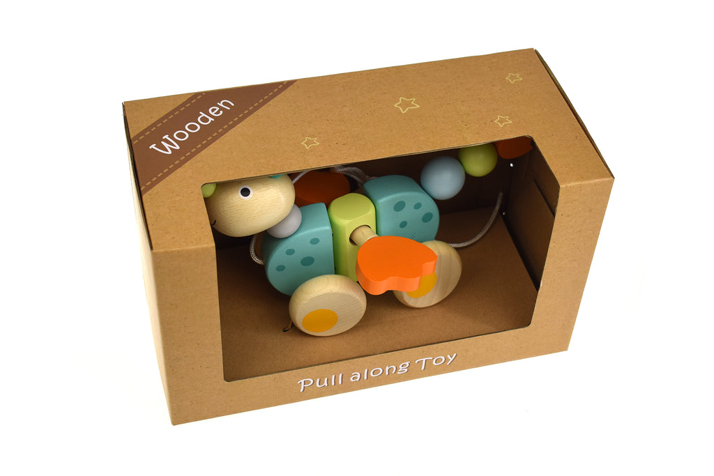 This pull along toy is great for infants. Dragon wings will flap up and down when pull a long. This toy will help with fine motor skill. It will make a great companion for the little ones as they take it walks with them during the day. Each toy is individually boxed. The bright colour body is painted with non-toxic paint and made with good quality wood.