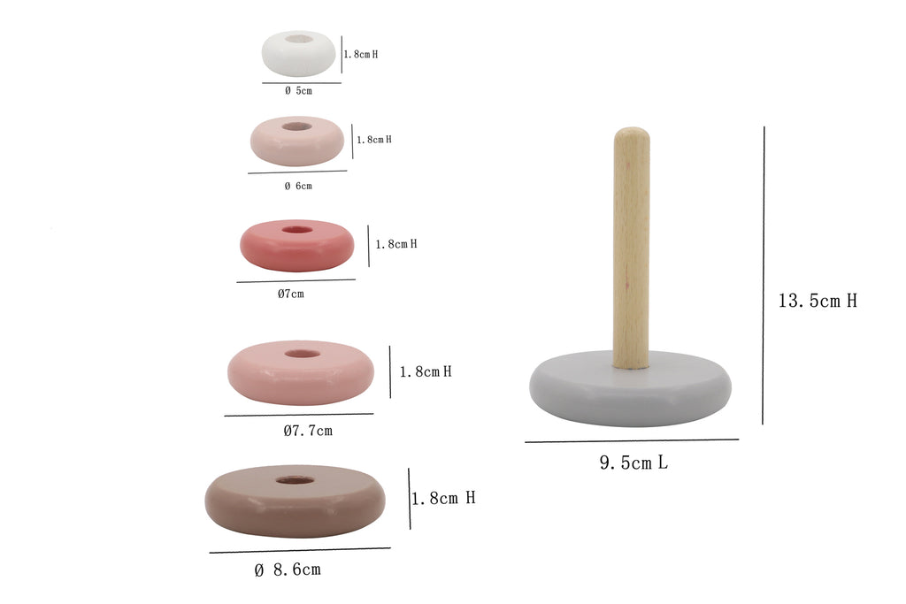 Traditional stacking tower with a modern colorful twist! This wooden stacker comes a solid base with five round stacking discs a child can thread onto the central post. Children can explore mixing up the rings, learning about sizes, color combinations and design. Develops motor skills and hand-eye coordination. Made from high quality wood and non-toxic paint.