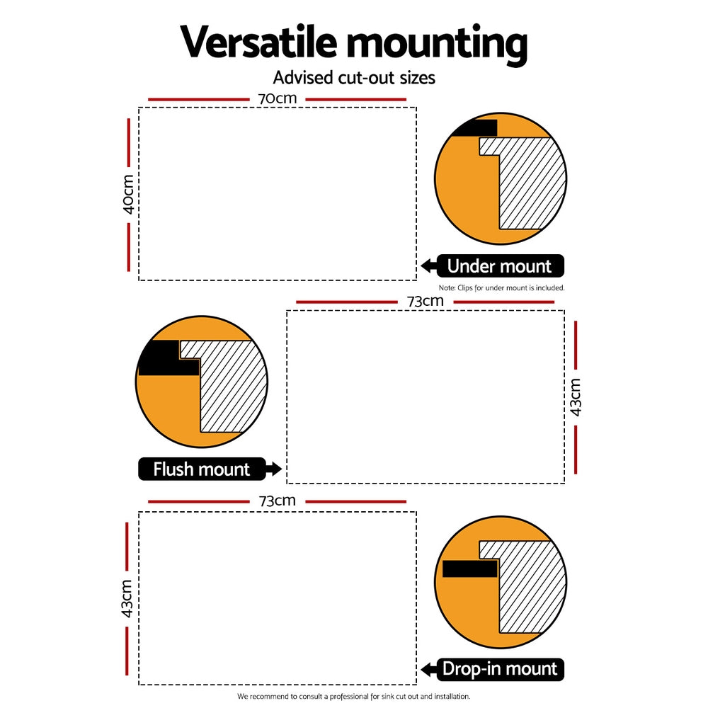 The Cefito Handmade Stainless Steel Sink is built to exacting standards so that you get the very best of quality materials and craftsmanship. It is crafted from heavy-duty food grade 304 stainless steel, unlike others that are made from inferior 201 grade or 304 imitations. Built to be scratch-proof, oil-proof and more importantly, bacteria-free, the silky-smooth satin-coated stainless-steel sink also features an X-flume design for easy drainage, deep and wide bowl for practicality, eco-friendly anti-condensation paint, and five sound-deadening pads. Suitable for drop-in, flush-mount or under-mount installation, our stainless steel sink should have a definitive place in your uncompromising kitchen.