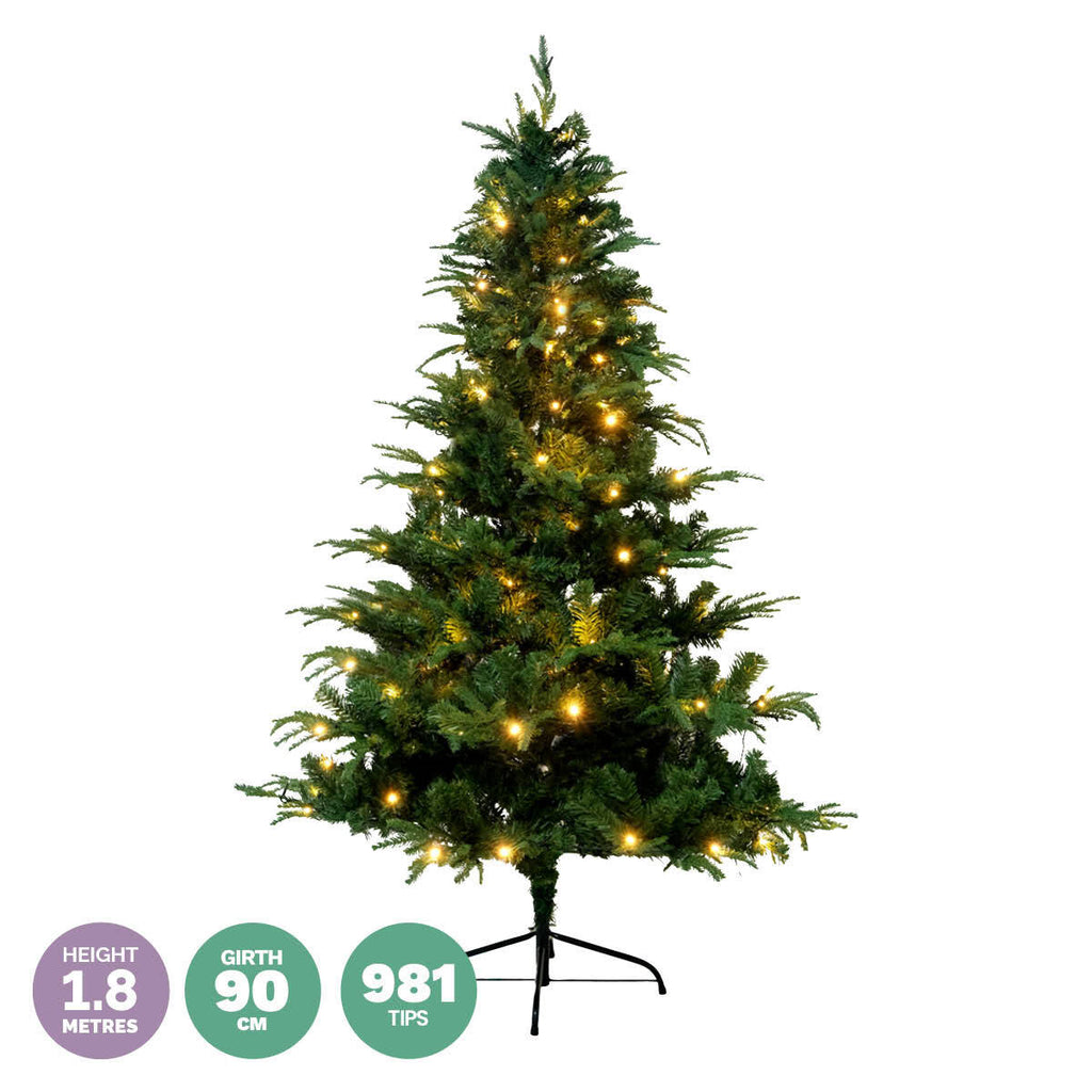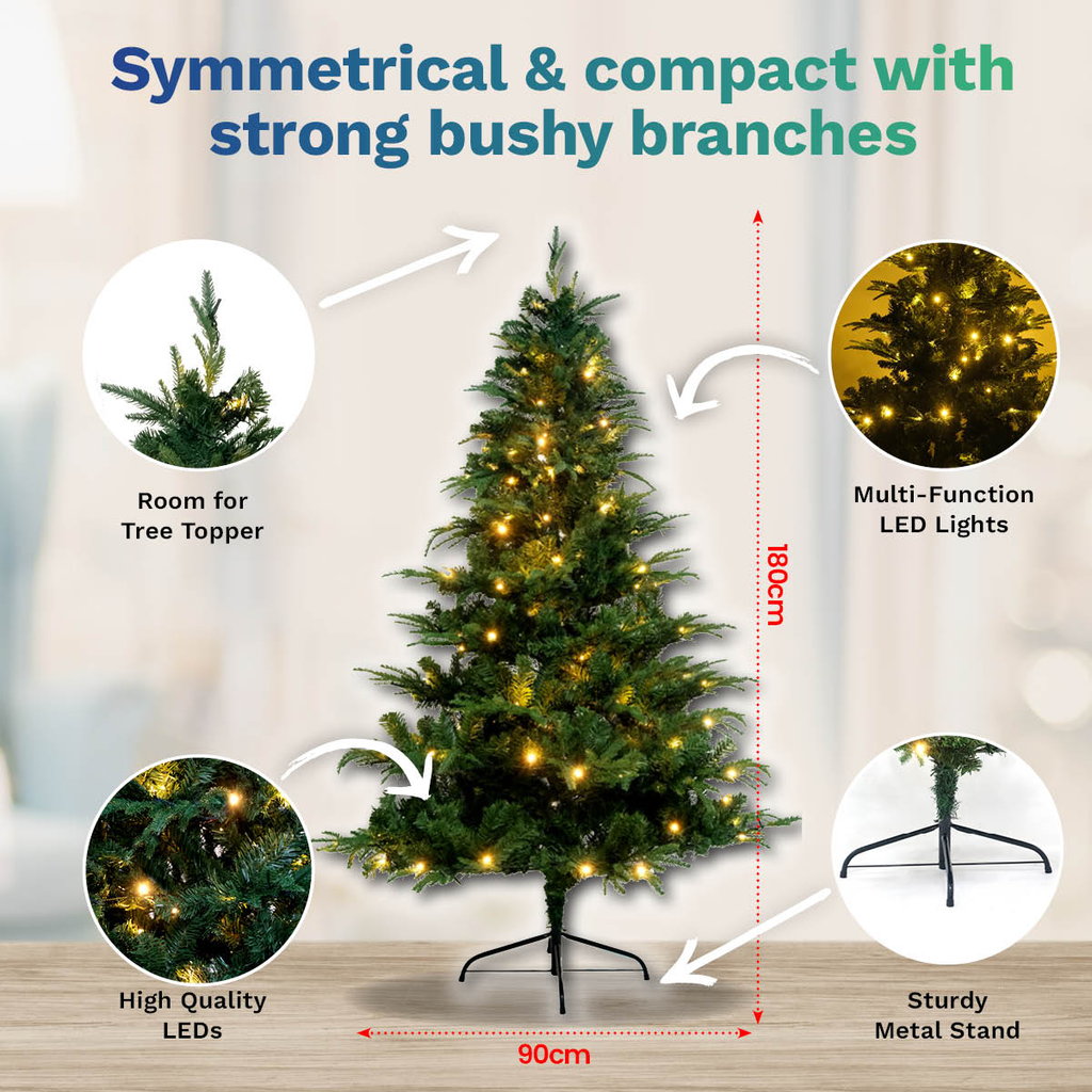 Christmas By Sas® A beautiful pine Christmas tree that stands at 1.8 metres tall. This stunning tree is fitted with 300 warm white LED lights that has 8 functions with memory. A captivating tree to display that will twinkle and illuminate your festive evenings.