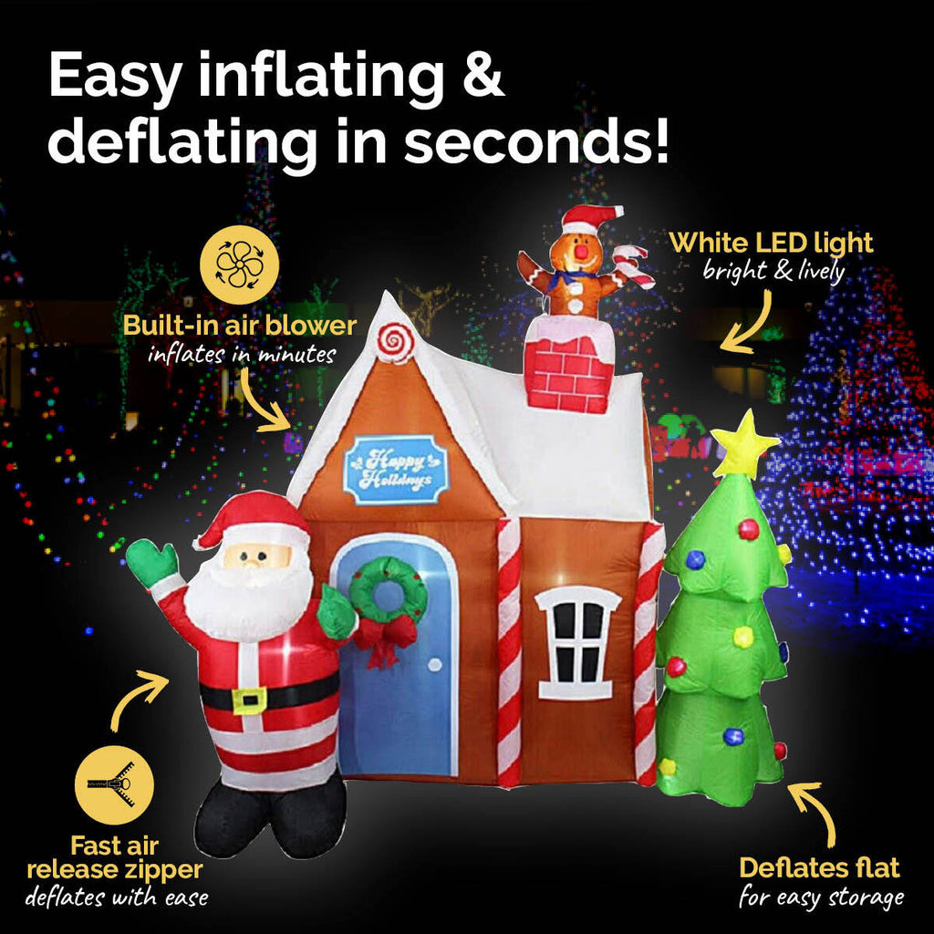 Christmas By Sas® Decorate and enhance your outdoor space with this wonderful gingerbread house with Santa, Christmas tree and gingerbread man. Featuring white LED lights, and fitted with a built-in air blower, this is a great addition in creating a festive atmosphere during the Christmas season.