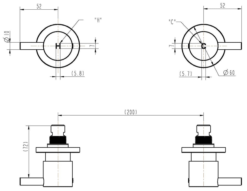 The Hot and Cold Stops have the following dimensions: distance between handles is 200mm; length of each handle is 52mm; and, diameter of each handle is 60mm.