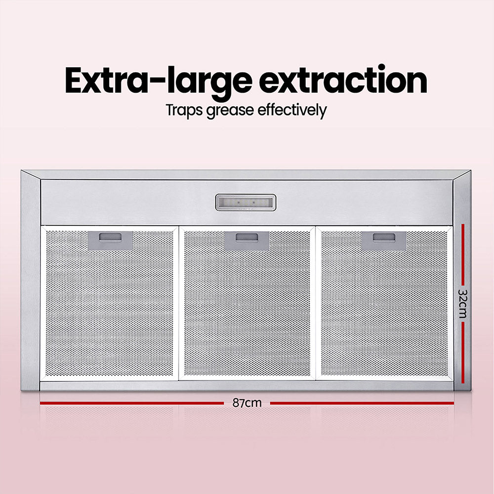 Thick smoke and steam from your cooking. Stifling odours all around. And your range hood is not doing its work to clear the mess. Not anymore with Comfee 900mm Range Hood. Featuring a powerful extraction rate of 550m³/hr from a high performance 110W rated motor, our stainless-steel range hood will clear the air of smoke, steam, odours and vapours in no time at all. The non-stick and removable 5-layer aluminium grease filter ensures all grease is efficiently captured. Completing the job is a 3-speed fan that can be easily selected with the rocker button switches. Clear and bright LED lights also provide vivid illumination for your cooking area, so you can see everything you're cooking.