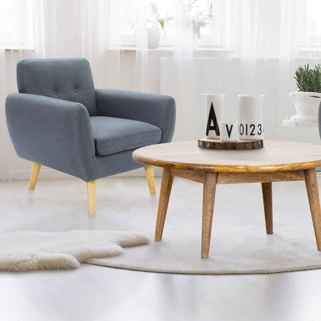A sofa is the focal point of a living room. Place this beautiful sofa, designed in the Scandinavian style, in your living room and it will instantly become the most stylish part of your home. The single-seater sofa is an epitome of superb craftsmanship. It showcases comfy looks, featuring tapered legs and outwardly sloping arms. It has a fixed backrest with button details and loose-style seat cushions with high-density foam for superior comfort. The arm chair in dark grey mixes easily with any interior decor style. The entire sofa is upholstered in 100% polyester fabric, which is soft and durable. The stunning sofa also features high-density foam, webbing, pocket springs, and S-springs that ensure complete relaxation for the body. The structural frame of the sofa is made of sustainably harvested solid wood and plywood, which gives it internal strength and resilience. The frame has a five-year warranty; the foam and springs have a three-year warranty; the fabric and stitching have a one-year warranty; and all other parts have a one-year warranty.