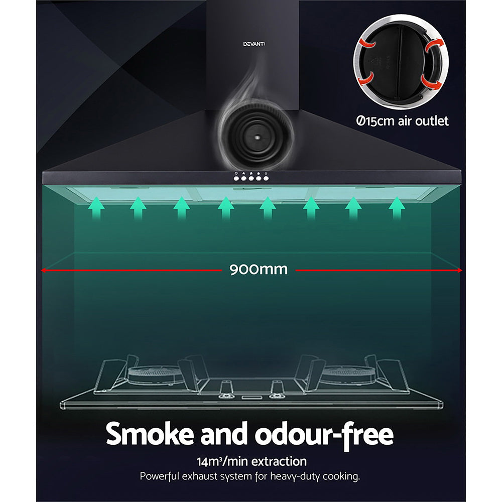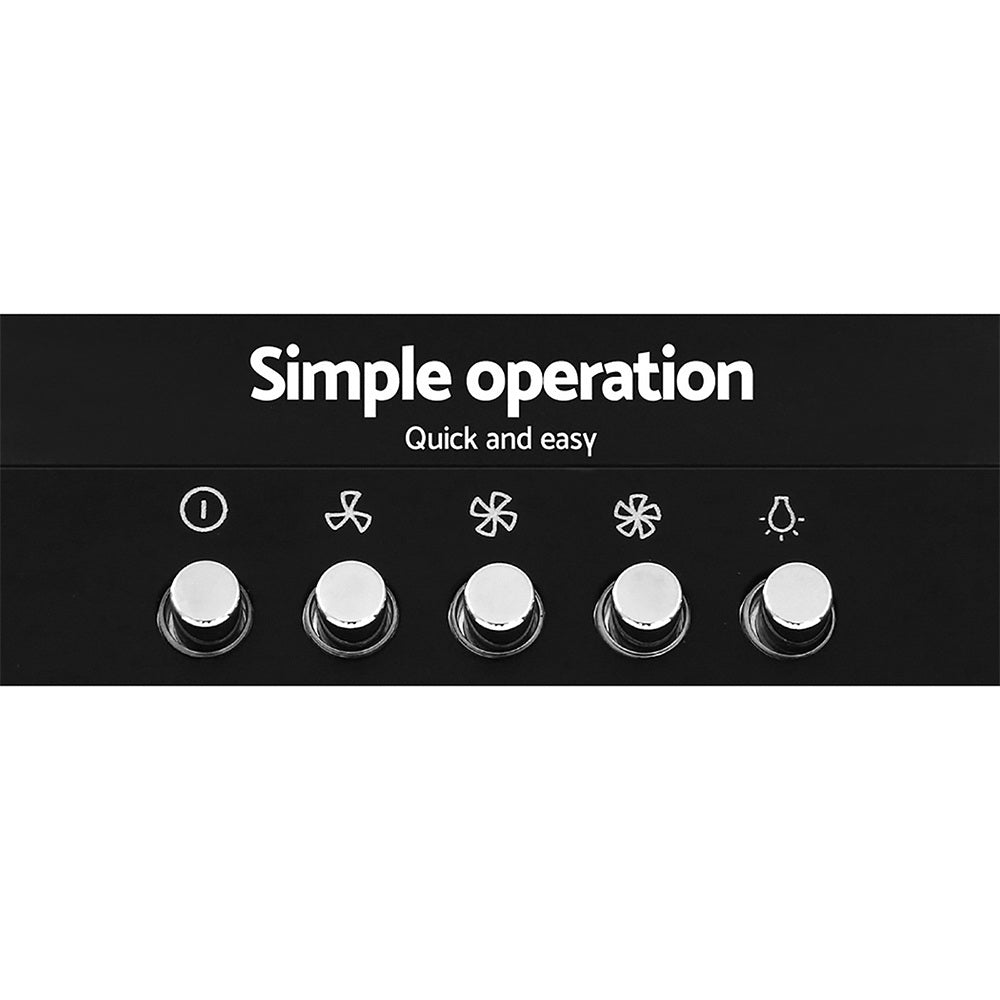 Say goodbye to smoky fumes and unwelcome cooking odours with our Devanti Range Hood. With its high-performance motors, the black powder-coated steel range hood provides a steady upflow and filtered extraction of fumes and oil to keep your cooktop area clean and fresh after every use. With its 3-speed rocker button switches, the extraction speed can be adjusted to suit the circumstances. Other features include three non-stick 5-layer aluminium filters that are removable and replaceable and LED lighting to facilitate your illuminated cooking. The range hood is wall mounted and the chimney can be adjusted to fit the installation space.