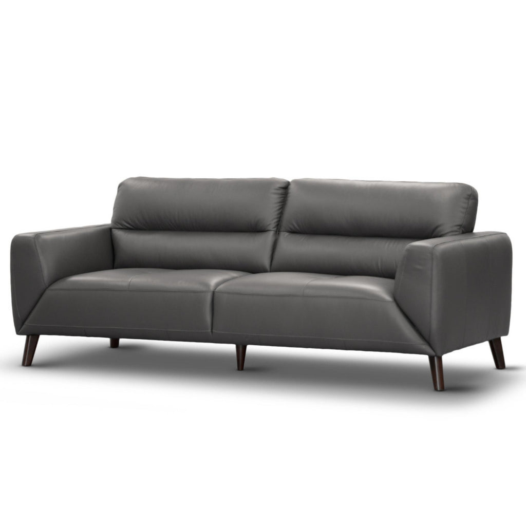 A luxurious 3-seater lounge that displays one of the best furniture arts. Place this beautiful sofa, designed in a modern style, in your living area and see it become the most lovable corner of the house. The adorable lounge features quilted seat details with super comfy lumbar support. The S-springs, webbing, and dense foam make the seats worth it. You can feel it when you sit or stretch your body on the lounge. The lounge has thick cushioning for added comfort, and it is upholstered in a 100% leather cover in gunmetal colour. The colour blends easily with any home interior theme or living space design. The stunning sofa also features strong, timber legs. The structural frame of the lounge is made of sustainably harvested solid timber and plywood, giving it solid internal strength and making it durable. The frame has a five-year warranty; the foam and springs have a three-year warranty; the leather and stitching have a one-year warranty; and all other parts have a one-year warranty.