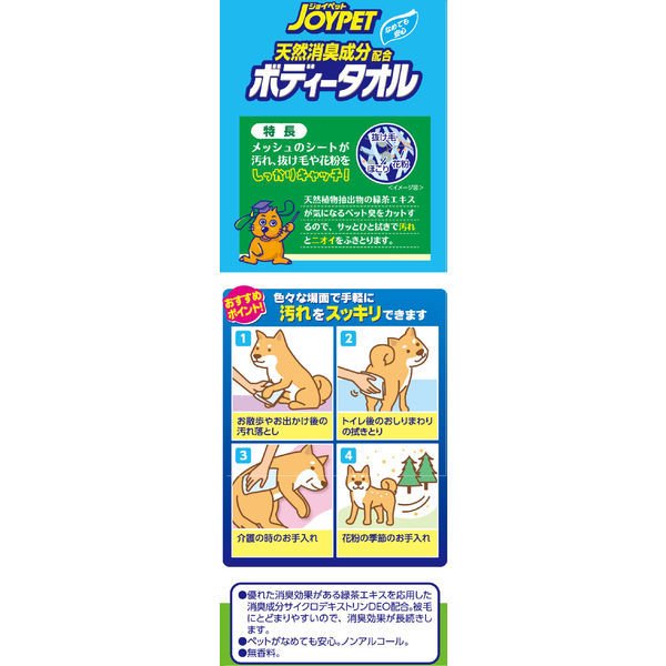 Contains cyclodextrin DEO, a deodorant ingredient using green tea extract, which has an excellent deodorizing effect. It stays on the coat easily and has a long lasting deodorant effect.
